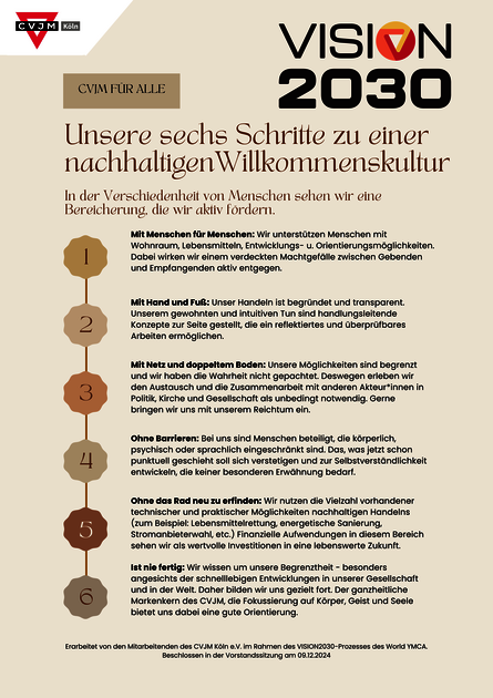 In der Gemeinschaft der Mitarbeitenden haben wir uns 2024 mit dem VISION2030-Prozess befasst. Dabei geht es um eine gemeinsame Vision der weltweiten CVJM-Bewegung, die in Anlehnung an die 17 nachhaltigen Entwicklungsziele der Vereinten Nationen entwickelt wurde. CVJM vor Ort sollen darin unterstützt werde, diese Vision in ihrer lokalen Arbeit umzusetzen und sichtbar zu machen. Unsere Ergebnisse haben wir in einem Statement, gleichsam als Handlungsorientierung, unter dem Motto „CVJM für alle!“ gebündelt: Wir fördern eine Willkommenskultur, die in der Verschiedenheit von Menschen eine Bereicherung sieht. Gerade in Zeiten, in denen Abgrenzung und Ausgrenzung Konjunktur haben und Radikalisierung und Gewalt um sich greifen, wollen wir damit einen Beitrag zu Frieden und Versöhnung in unserem Wirkungskreis leisten.
